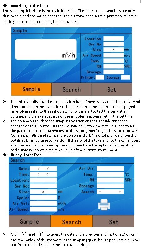 - The parameters such as the sampling position on the right side cannot be changed on this interface. It is only displayed. Before the test, you need to set the parameters of the current test in the setting interface, such as Location, Ser No., size, printing and storage function on and off. The display of wind speed is obtained by air volume conversion. If the size of the tuyere is not the current test size, the number displayed by the wind speed is not acceptable. Temperature and humidity show the real-time value of the current environment.