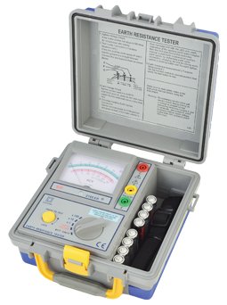 ● Capable of measuring earth resistance and earth voltage. ● 2mA measuring current permits the testing of earth resistance without tripping earth leakage current breakers in the circuit under test. ● In addition to facilitating for precision measurement, test leads for simplified two-wire measuring system also are supplied as standard accessories. ● Battery operated. ● Battery life indicator. ● Calibration performed with supplied test leads.