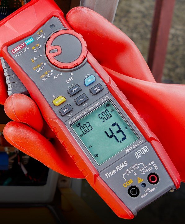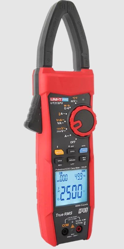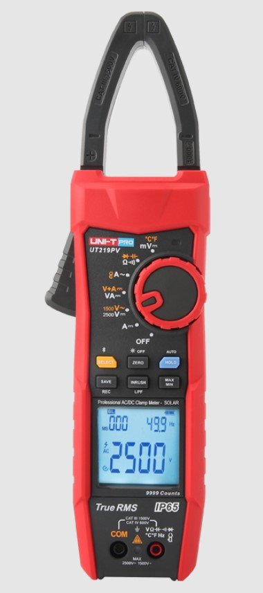 UT219PV is a true RMS photovoltaic dedicated AC/DC clamp meter (hereinafter referred to as clamp meter) designed specifically for photovoltaic high-voltage environments. It has a fully functional automatic range, with a display digit of 9999, and superior performance. It can measure various parameters such as AC/DC voltage, AC/DC current, low-pass filtering voltage/current, surge current, peak current, DC power external flexible clamp, resistance, circuit on/off, diode, capacitance, and temperature. It has a fully functional automatic range, with a display digit of 9999, and superior performance. It can measure various parameters such as AC/DC voltage, AC/DC current, low-pass filter voltage/current, surge current, peak current, DC power external flexible clamp, resistance, circuit on/off, diode, capacitance, and temperature. In addition to being used in photovoltaic scenarios, clamp meters are also suitable for other high-voltage scenarios, such as energy storage systems, UPS uninterruptible power supplies, and large motors.